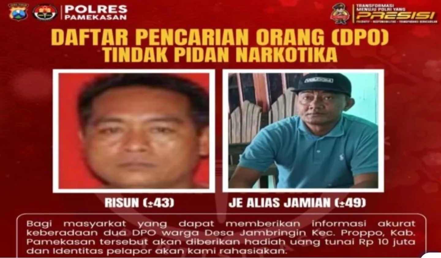 PAMEKASAN – Dalam upaya memberantas jaringan peredaran narkoba di wilayahnya, Kepolisian Resor (Polres) Pamekasan, Jawa Timur, memberikan imbalan uang tunai sebesar Rp10 juta kepada masyarakat yang bisa memberikan informasi akurat tentang keberadaan dua orang yang masuk dalam daftar pencarian orang (DPO).